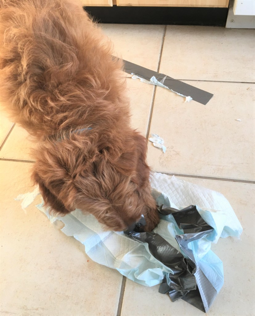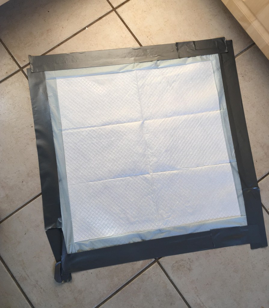 “Give Gracie a roll of duct tape to play with.” (I assume the idea is to redirect her attention away from the duct tape holding down the pee pad.)