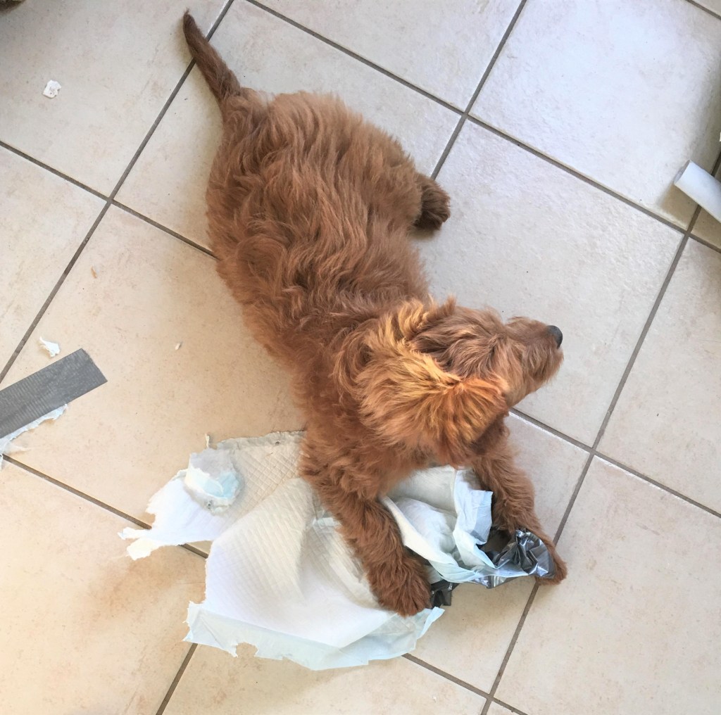 Gracie continues her terrible habit of chewing up her pee pads into shreds. She will usually grab the pee pad when I’m not looking then shred it to pieces. As a result, I frequently have to remove the pee pad from the floor. But subsequently (again when I’m not looking, of course), she pees directly on the floor.