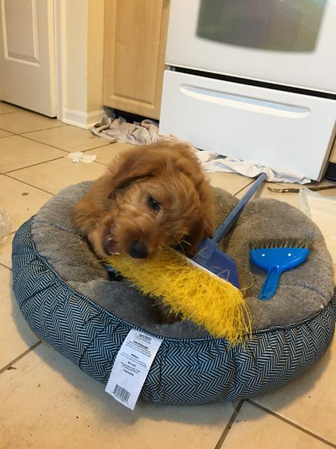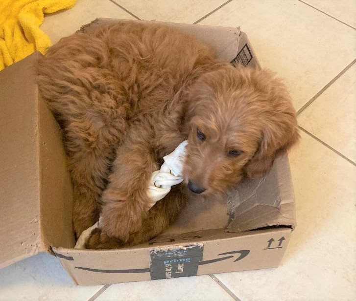 - Favorite dog toys (dustpan and hand broom, empty plastic drinking bottles, horseshoe pad, empty Amazon boxes, KONG rubber toy, stuffed dog toys)
