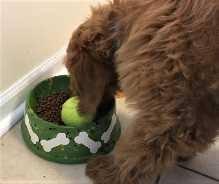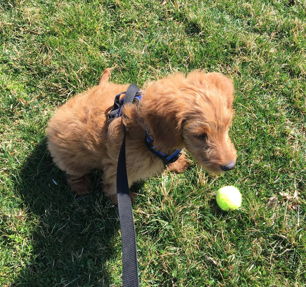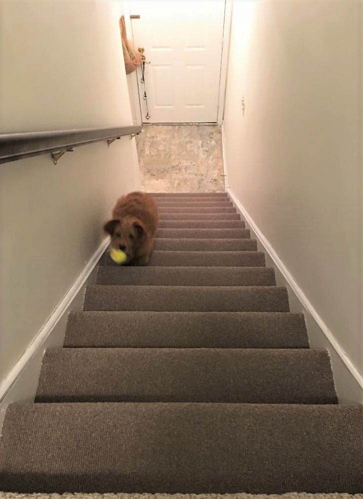 So, Gracie and I are continuing with primarily indoor activities such as chasing tennis balls on the stairs. Gracie has learned to stand at the top of the steps and knock the ball down the steps, go down to get it, and bring it back up. It’s a nice little self-contained cycle that keeps her busy for at least a few minutes.