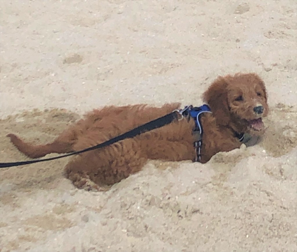 The park includes a volleyball court with a sandy surface. Gracie LOVES to dig in the sand! In this photo, she’s sitting in a hole she dug and maybe you can see the sand on her face.