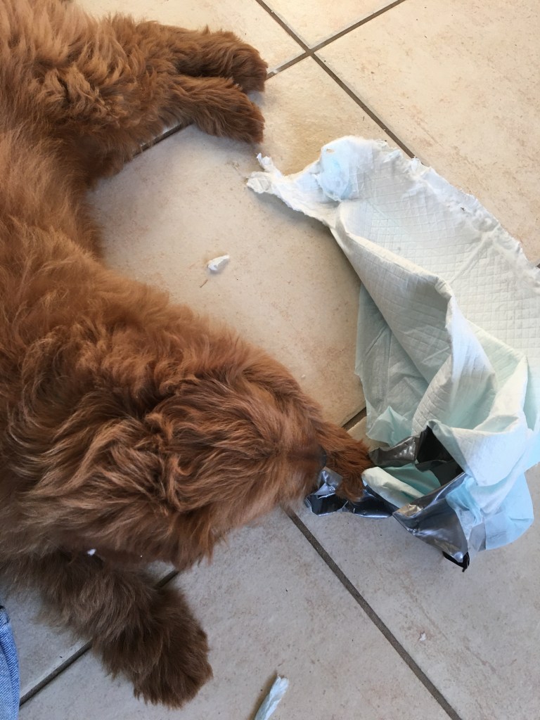 So, when one or more these “hints” occurs, I quickly run across the kitchen, grab a pee pad and place it under her. If she has to “go”, she’ll use the pee pad. If she doesn’t have to “go” she’ll chew up the pee pad.