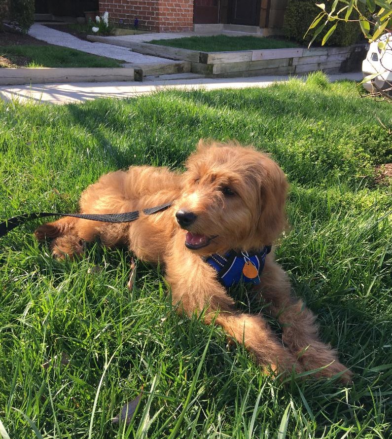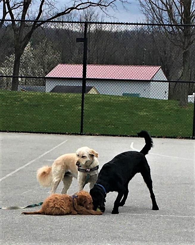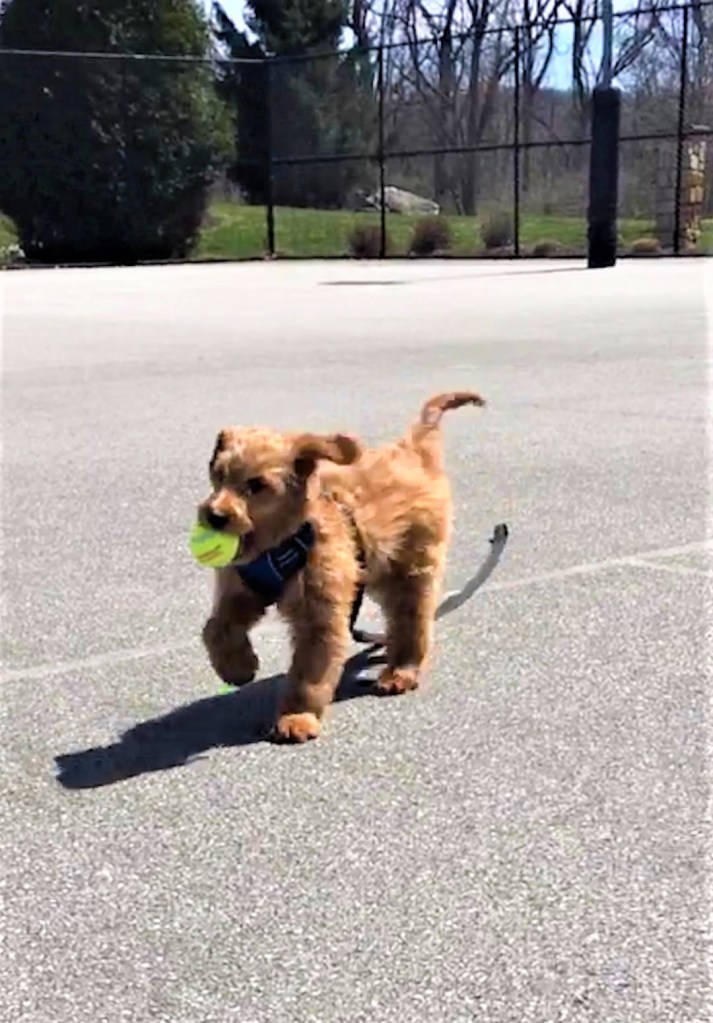 Yesterday afternoon we had a “doodle fest” in the basketball court at Wilson Farm Park. There were five dogs there and all five were “doodles” including Boo, Rosie, and Holiday (all labradoodles), as well as Quinn (a goldendoodle) and Gracie (mini goldendoodle). They all happily played together and chased tennis balls for about an hour. Gracie had a blast. I came back with a completely slobber-soaked tennis ball. It wasn’t the same tennis ball I left with earlier, but Gracie seems to like this far dirtier, bacteria-laden one so much more than her other bright new one.