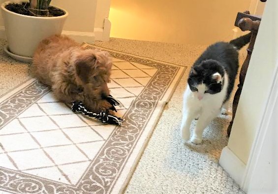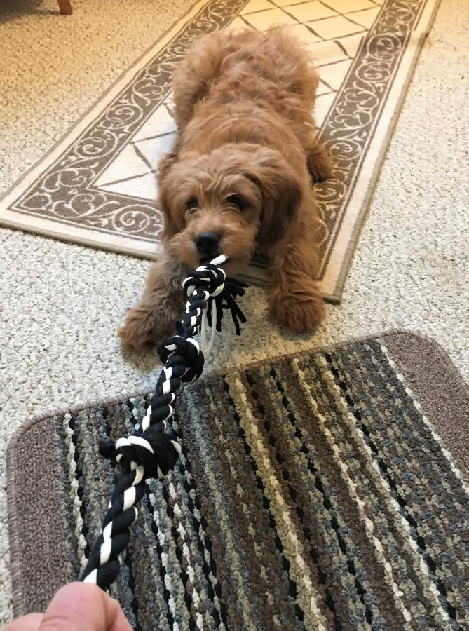 I went to the Dollar Tree today and simply couldn’t resist buying yet another toy for Gracie. Gracie is preoccupied with it in the shot above and it probably helped deter her from engaging with Chloe. Here’s a shot of the two of us playing tug-of-war with the new toy….