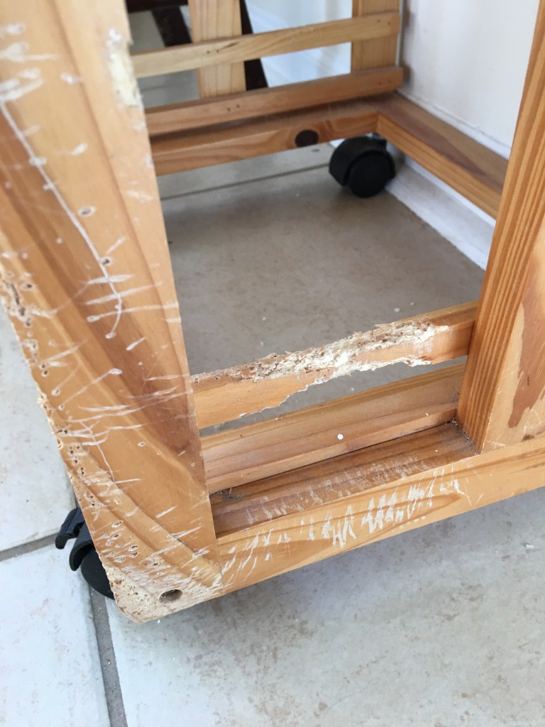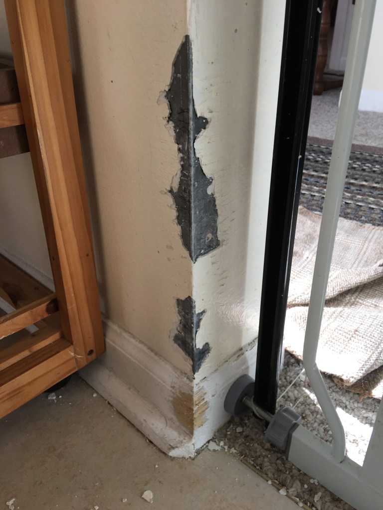 Tom and Jan, please let your friends know I appreciate their giving me that bottle of “OUT! BITTER CHERRY CHEW DETERRENT.” I was eager to try using it on my kitchen wall where Gracie has been chewing off the paint and plaster, as well as on the wooden cart in the kitchen. I’ve been applying according to directions, but unfortunately so far Gracie just licks it up – apparently finding it tasty – an appetizer, before she resumes her chewing destruction. (A few picts of Gracie’s handiwork below.)