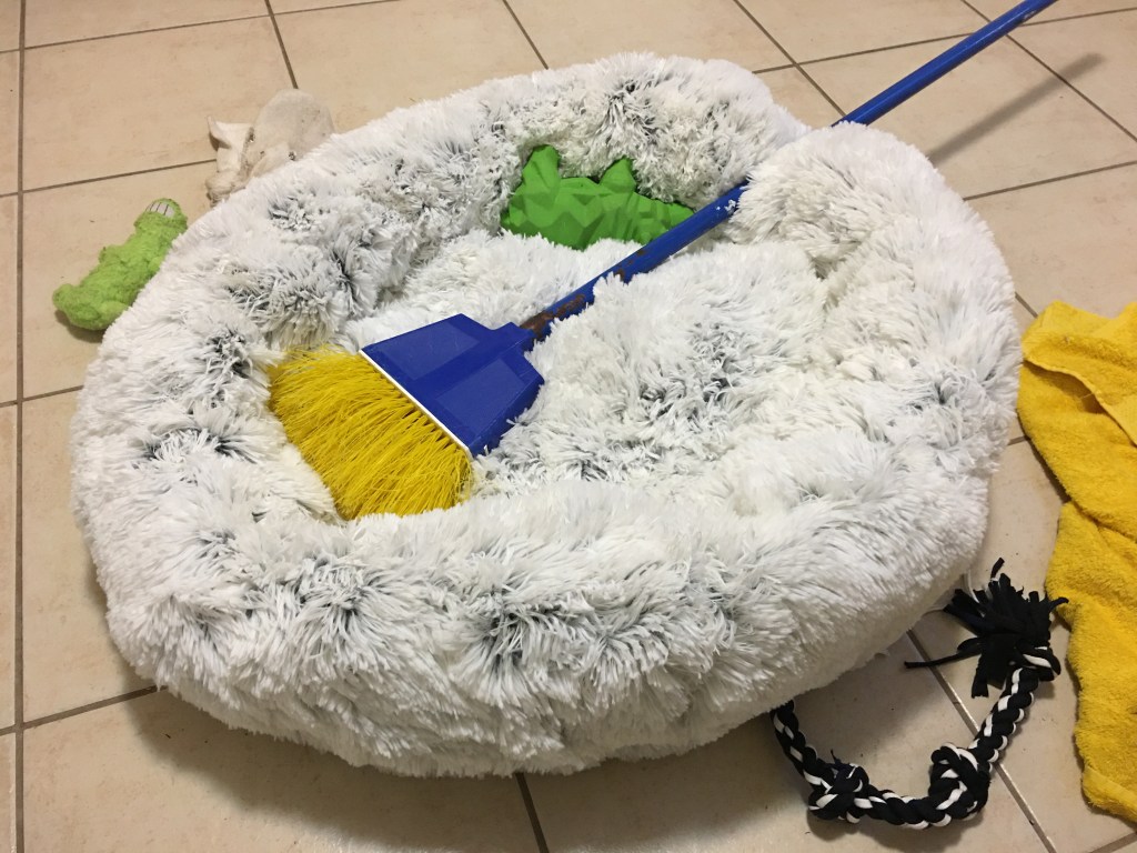 Gracie received a wonderful present from Auntie Marci and Auntie Karen – a super-fluffy, plush, comfortable bed. Gracie LOVES it! She is VERY grateful to her two aunties for this marvelous gift (and I am too)! I knew it was already a real hit when Gracie immediately dragged two of her favorite toys into it – the broom and Mr. Hippo!!