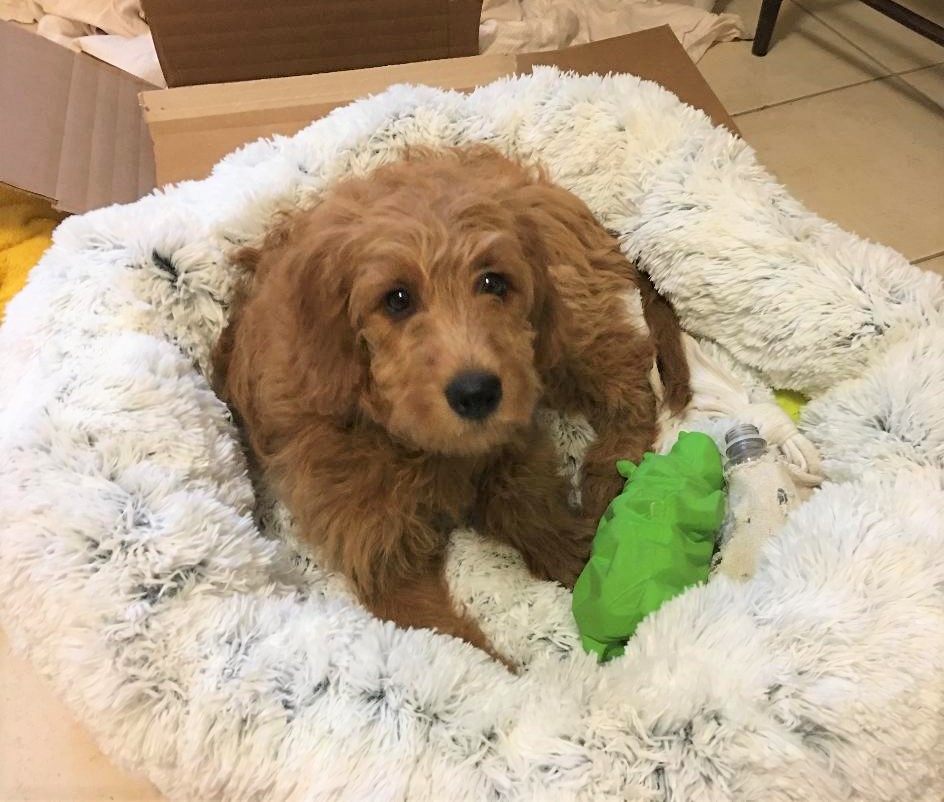 (Above: More toys in the new bed. If you look closely, in addition to Mr. Hippo, you can maybe see the “bottle in the sock” toy and a yellow tennis ball buried in the fluff…)