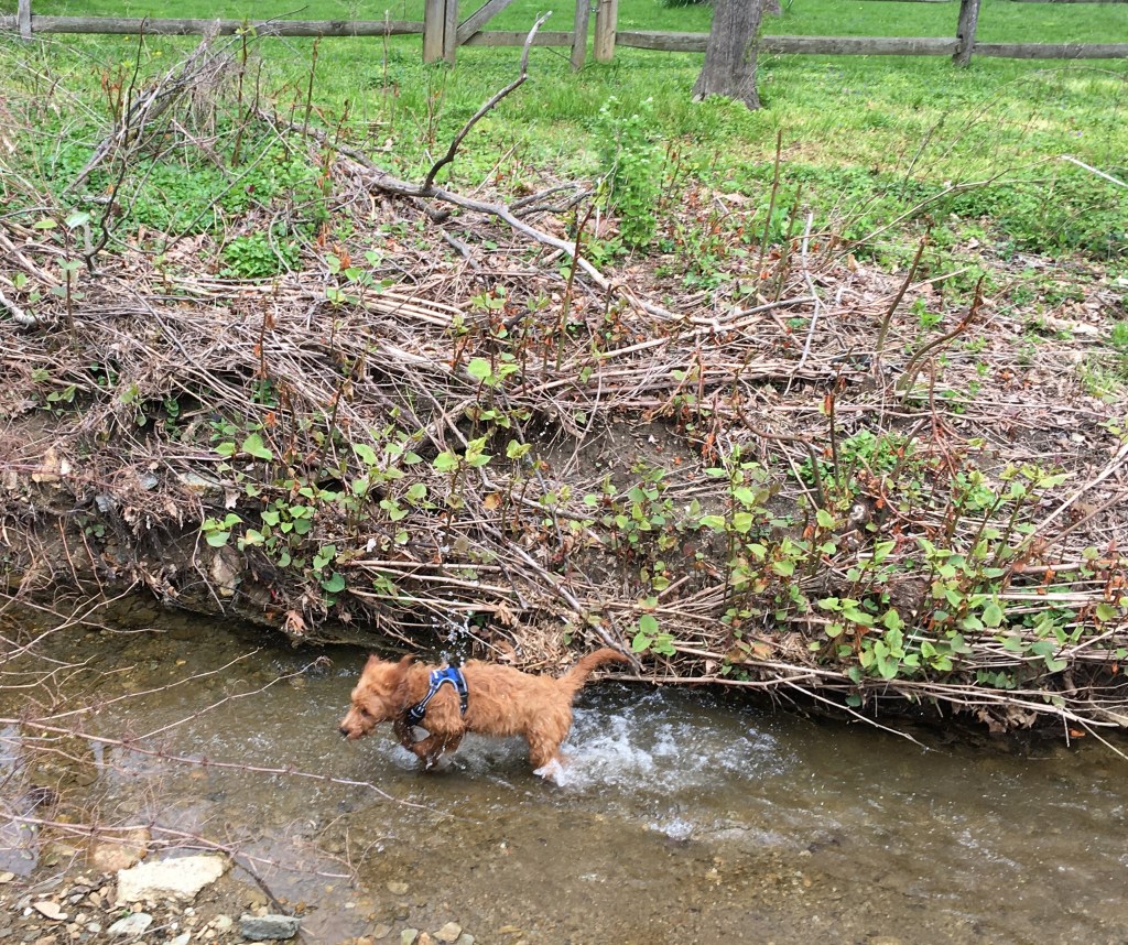 Later we explored a new dog park, Mill Park, near home. We followed another dog owner, along with her dog Luna, to a large stream and swimming hole, hidden by trees, on the back side of the park. Gracie jumped in the water after Luna and for the first time in her life, I watched Gracie SWIM!! She is real a natural, instinctively doggie-paddling and clearly embracing the experience!! A water-hound myself, it made my heart sing!! Gracie found a fellow water dog playmate in Luna and they had a blast. The video links below show Gracie in the swimming hole retrieving a stick (Video 1) and romping by the stream with Luna (Video 2).