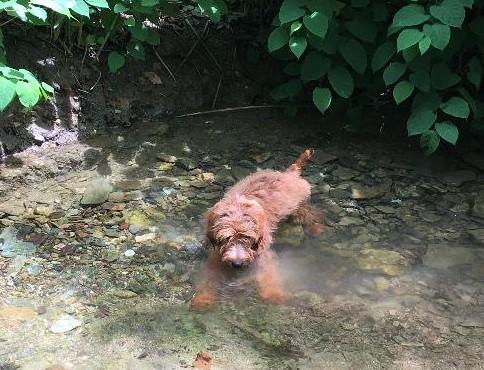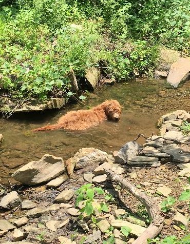 Gracie basking in the stream water as the temperature climbed toward 85 degrees today…