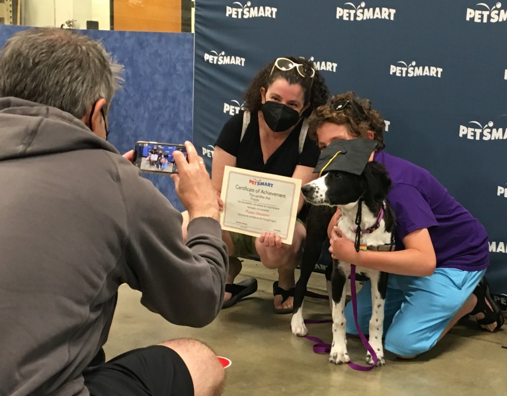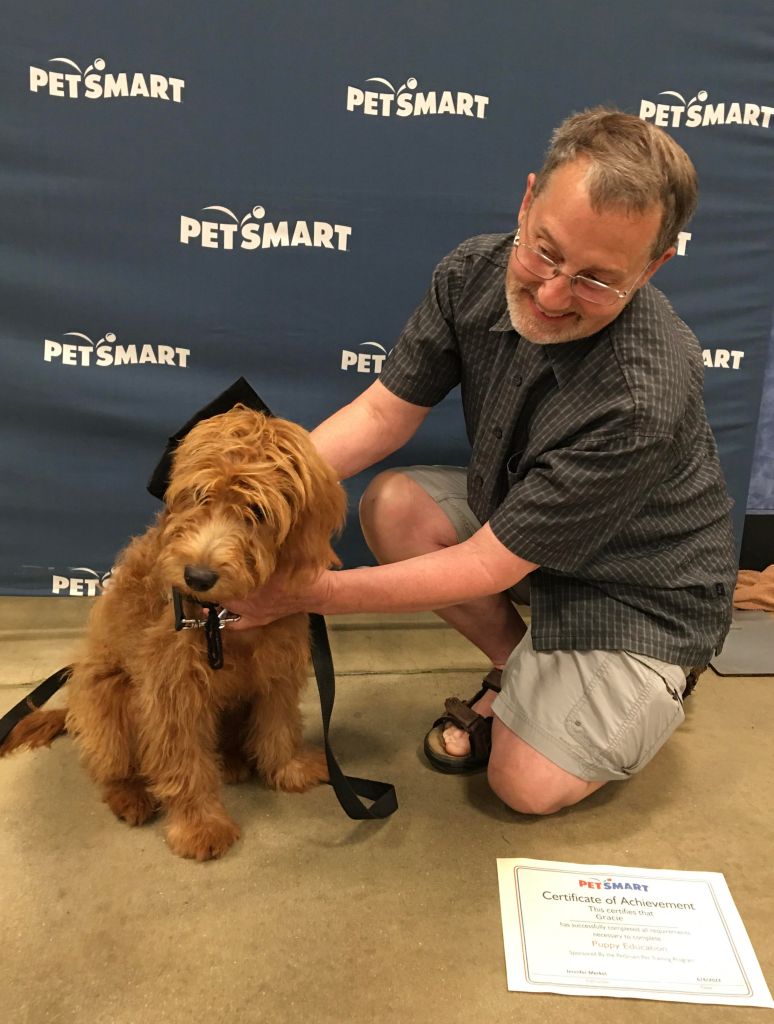 The certificate shown in the picture announces that Gracie has SUCCESSFULLY COMPLETED ALL THE REQUIREMENTS OF PUPPY EDUCATION at PetSmart!! Though, I have to say, there really weren’t any requirements to begin with except to show up for class. Nevertheless, how proud I am of my little Golden Noodle! And even Auntie Marci and Auntie Karen attended the “ceremony” to observe the pomp and circumstance!!