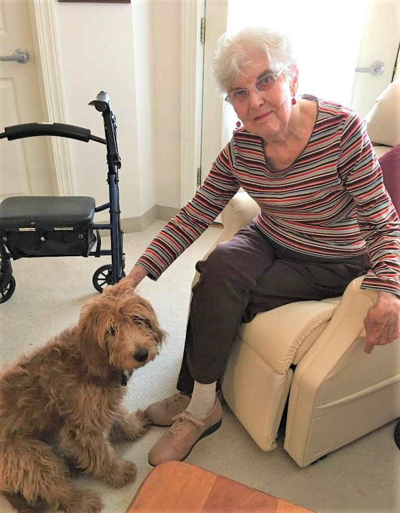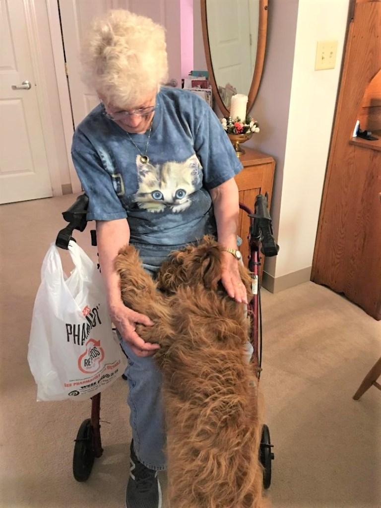 Gracie has endeared herself to many of the residents at the Oaks. Here are pictures of Gracie with Mom and one of Gracie with Mom’s wonderful friend Linda. (Guess what OTHER animal Linda loves, besides the dog.)