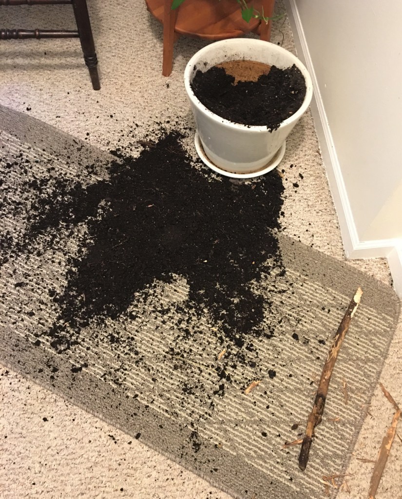 Last evening Gracie dug in my large potted plant in the hallway. She had previously left it untouched, but for some reason decided now was the time to wreck it. She threw the wet dirt from the pot onto my carpet and then she traipsed through it, leaving her paw prints everywhere. I found the plant itself in another part of my condo.