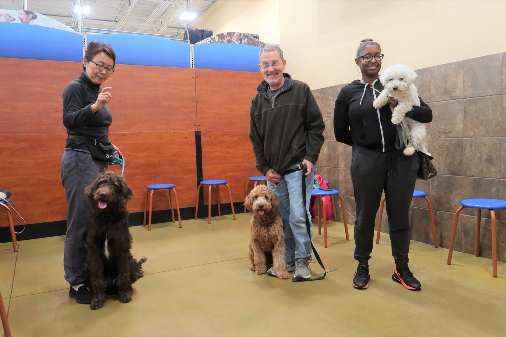 Below – The full 11:30am October 2022 Pet Smart Intermediate Training graduating class. Doggies are: Geo on left, Gracie in center, and Diamond on the right. (In characteristic dog-person fashion, I never learned the other owner names.)