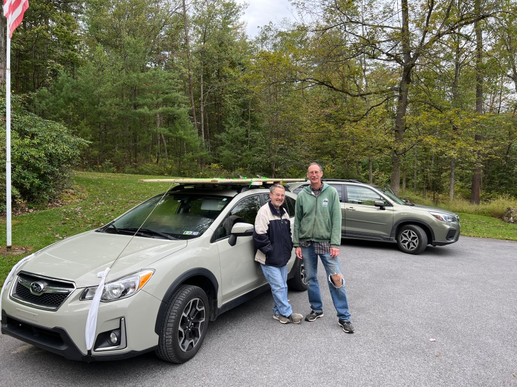 How to transport everything 200 miles to my home in my Subaru Crosstrek and prevent the plywood from soaring off the roof onto the Pennsylvania Turnpike at 70 miles per hour? With ratchet straps, rope, ingenuity (Tom’s), slower driving (me) and much luck…