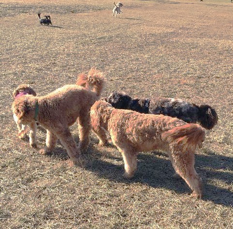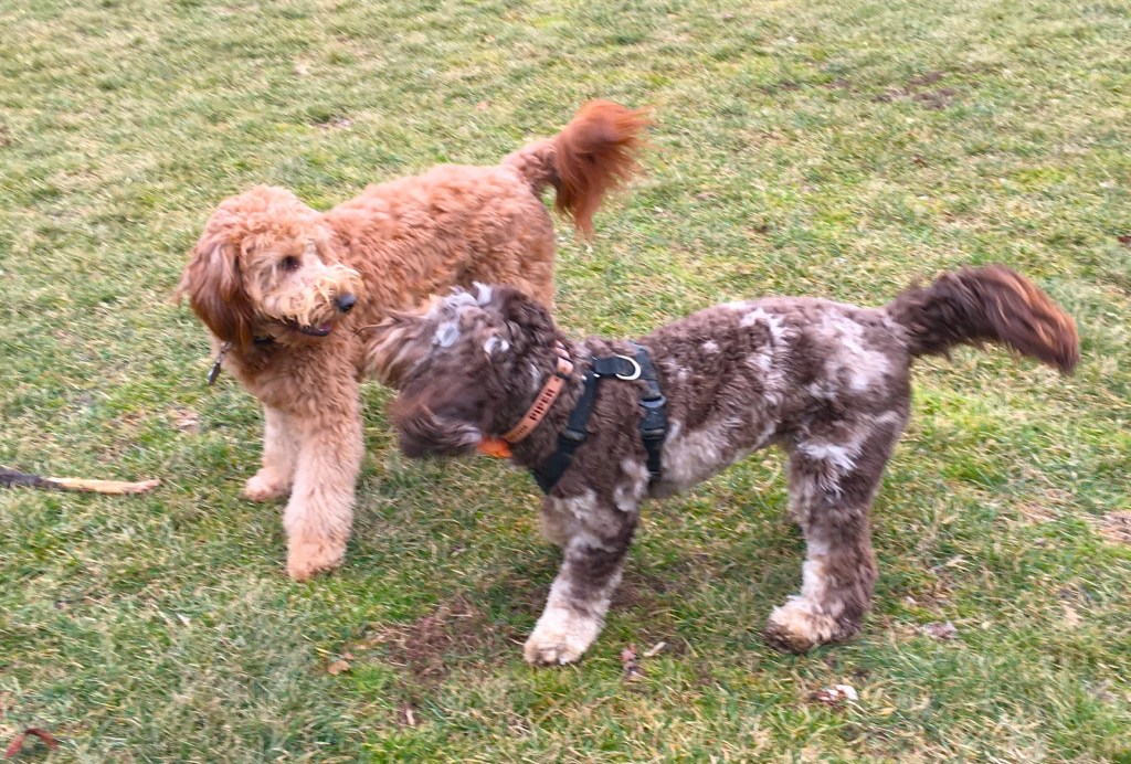 Pictured below is Gracie with her friend, Piper, in Teegarden Park. Piper is a sweet mini labradoodle about the same size and age as Gracie. They are perfect playmates, spending heaps of delightful time romping and wrestling.