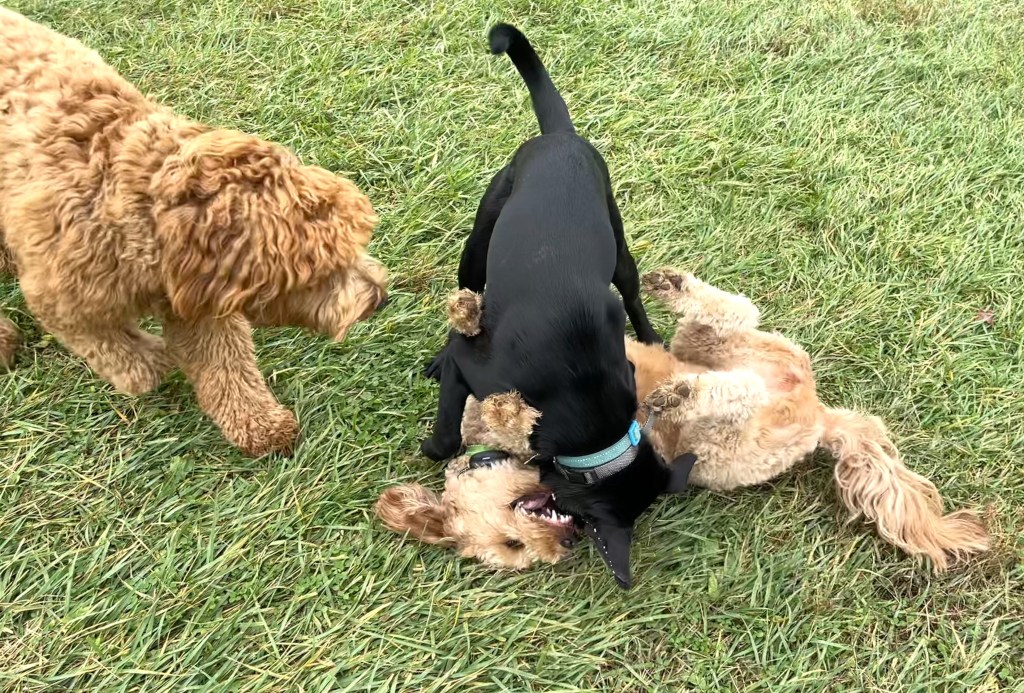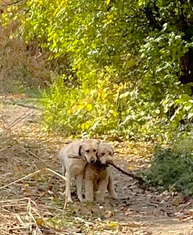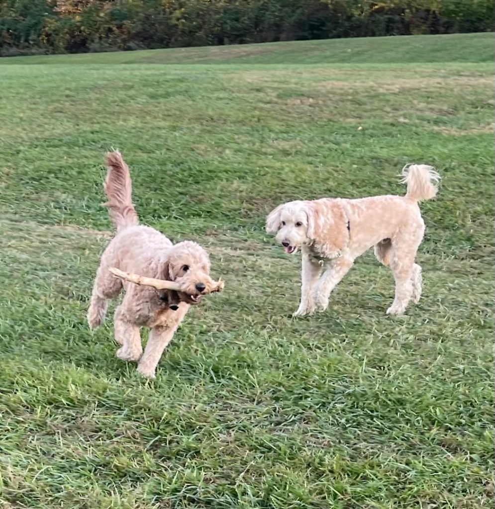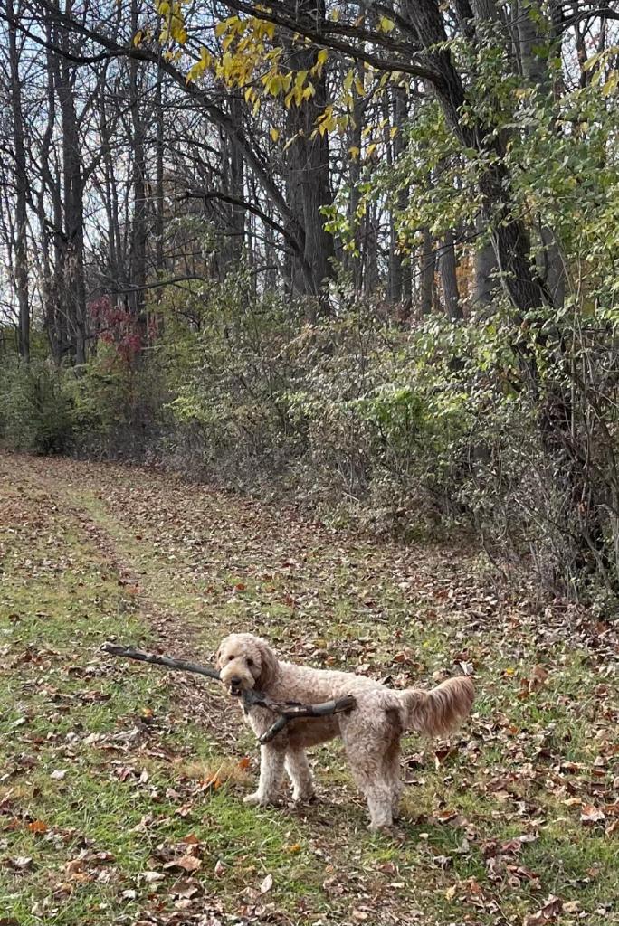 I’m very relieved my noodle is feeling better! For the past few days on our excursions, she’s been happily running in fields, hunting for sticks, sniffing out secret messages, barking at wildlife (deer, turkey vultures, squirrels), rolling in smelly stuff, and playing “hide and seek” in the bushes. And, in more good news, starting this week she has clearance from the vet to be around other dogs.