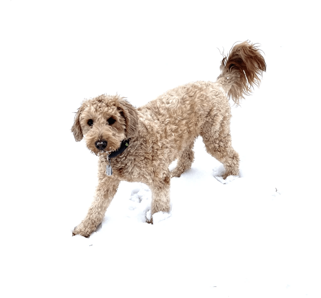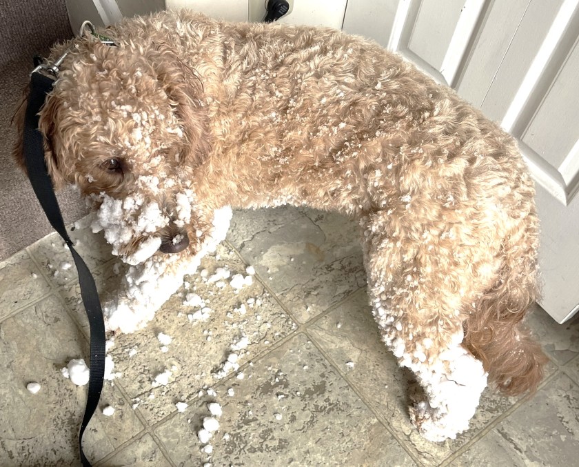 By the time we arrived back home, Gracie had thick clumps of ice caked on her paws, all four of her legs. her snout, and her belly. (I used warm water to remove all of the ice.)