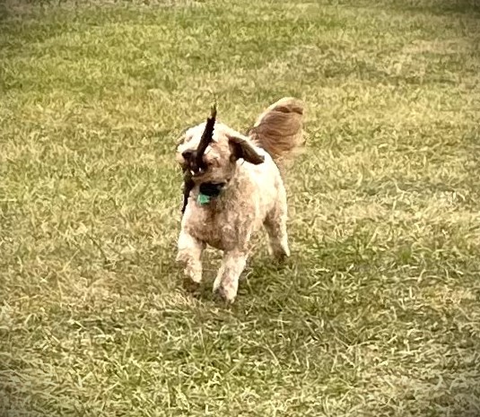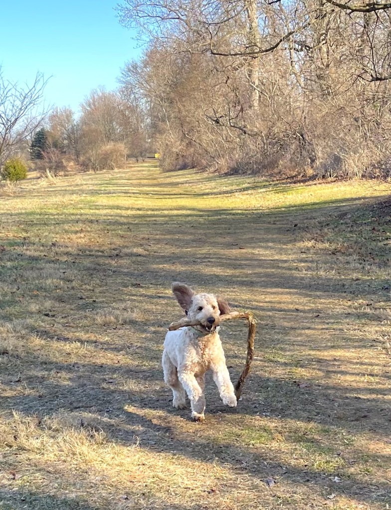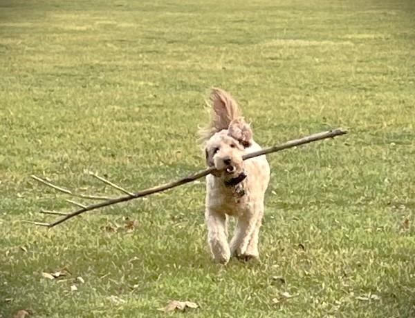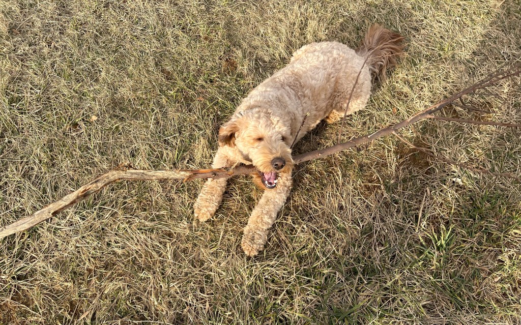 In the aftermath of the event, the strong winds and supersaturated ground left countless toppled trees and downed branches in its wake. Now, everywhere we go, Gracie finds a massive oversupply of STICKS. For her, that’s been like Christmas all over again.