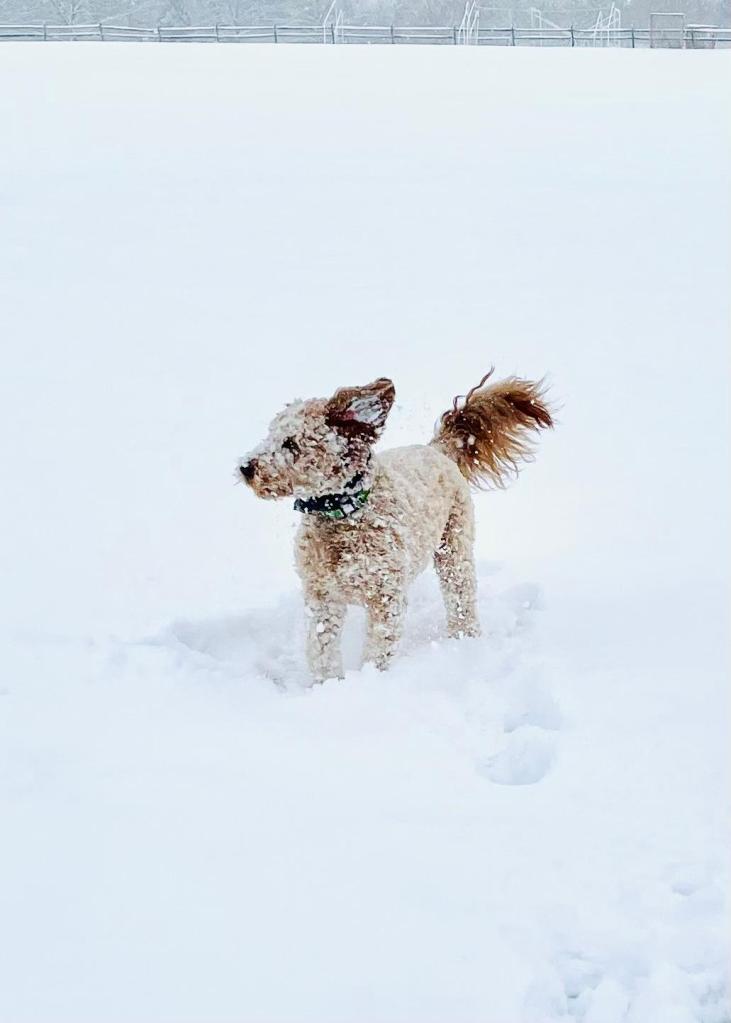 So, in the afternoon, Gracie and I walked to nearby Wilson Farm Park. I typically keep her on a leash in the park (it’s a rule), but with the exception of one wacky guy out there running in shorts, we saw no other people and no other dogs. So, I let Gracie off her leash. From the moment I released her, she sprinted – to romp, race, poke, dig, sniff, and roll in the snow. We trekked all through the park, forming fresh tracks everywhere we went. Gracie was exhilarated.