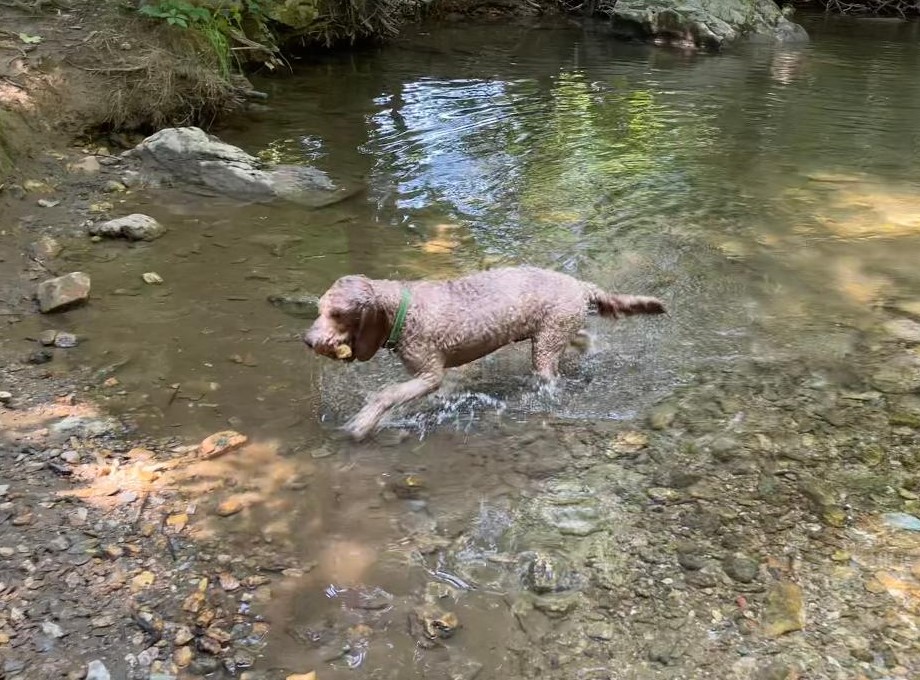 She recently developed a new aquatic activity: she dives for rocks. I’ll toss a rock into the stream, Gracie will plunge in after it, dive under the surface (she resembles a duck with her head underwater and her behind in the air), grab a rock (any rock she finds – rarely the one I tossed), carries it to shore, and carefully searches for a spot where she deems as the ideal location to set it down.