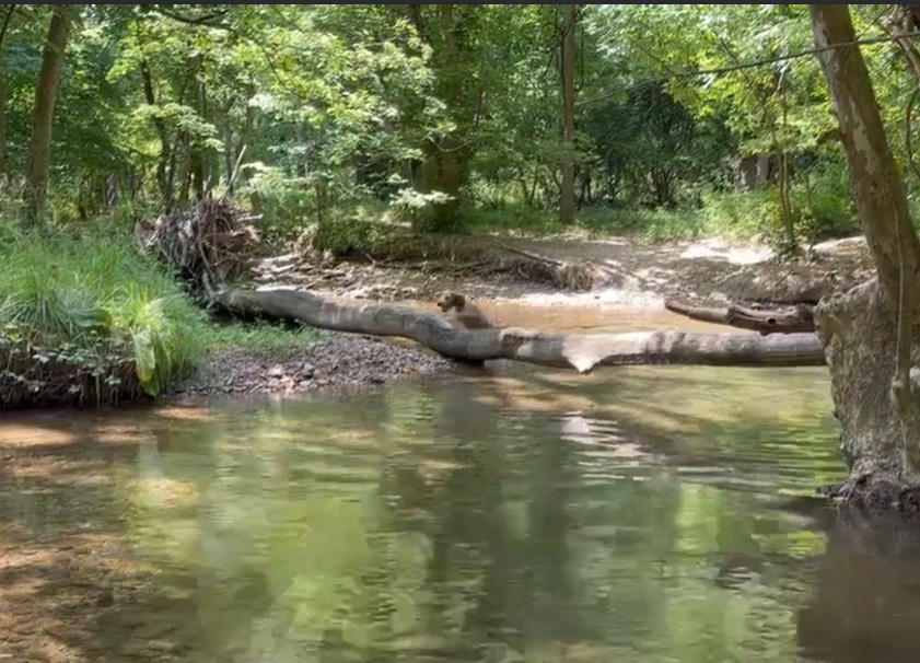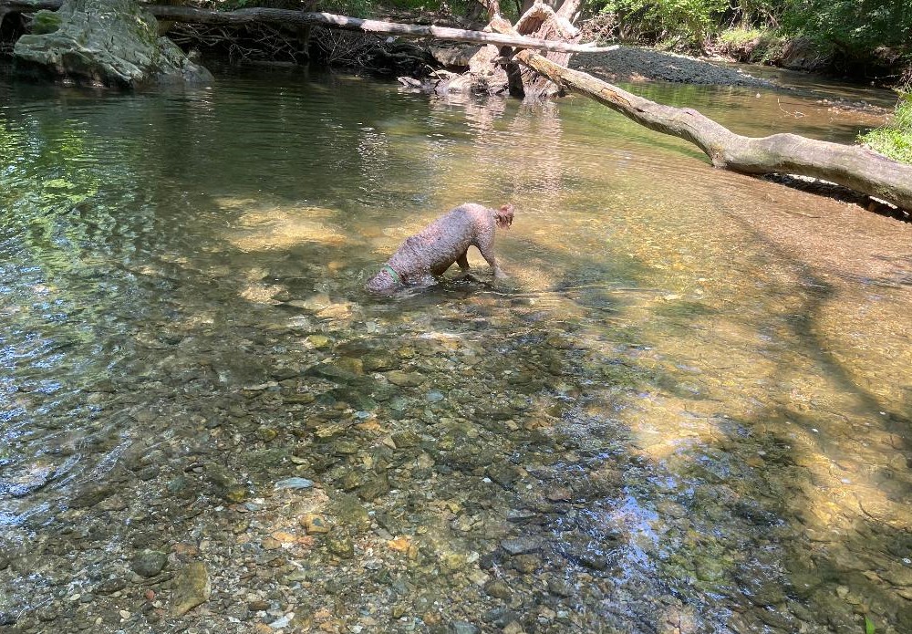 Gracie and I have fallen into a routine during these blazing-hot summer days. Typically, we’ll have a long outing mid-day to the swimming hole in Chesterbrook. Gracie LOVES the swimming hole. While there, I stand at the edge of the creek and toss her favorite orange ball into the water. She swims to retrieve it, carries it back, drops it near me, and wades into the water to wait for the next toss. Then we repeat it 30 or 40 more times.